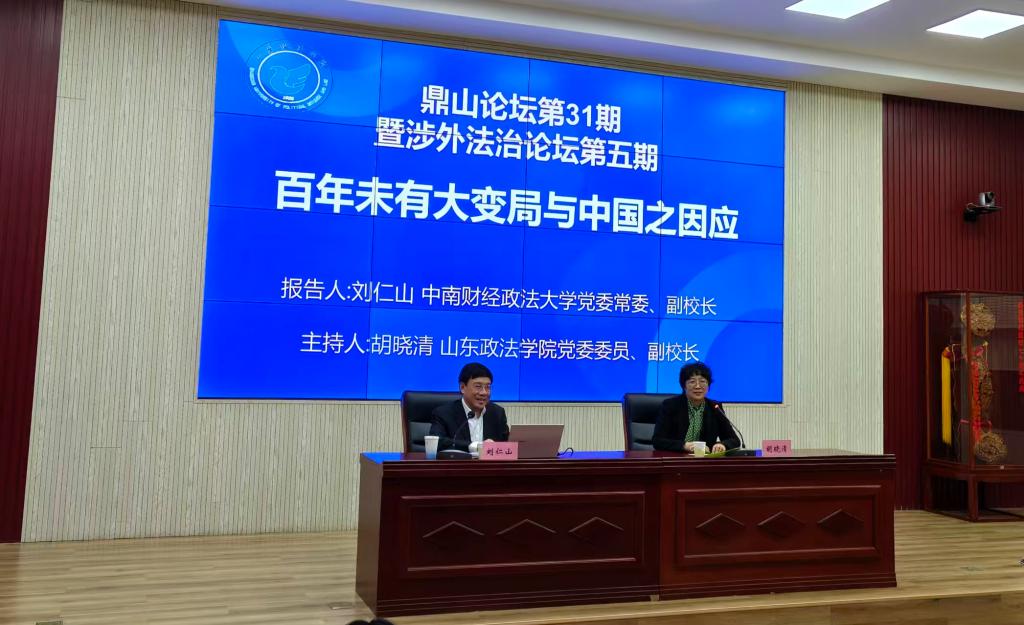 1220日,鼎山论坛第31期暨涉外法治论坛第5期在知行楼庭审直播室顺利举行,本期主题为“百年未有大变局与中国之因应”。论坛特邀中南财经政法大学党委常委、副校长刘仁山教授担任主讲嘉宾,就百年未有之大变局提出的背景、百年未有之大变局下中国面临的挑战、百年未有之大变局下中国的应对展开深入讲解。本次讲座由山东政法学院党委委员、副院长胡晓清教授主持,涉外法治学院与经济贸易法学院联合主办。