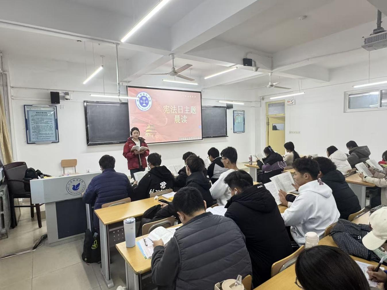 清晨的校园里,2025级学子齐聚教室开展宪法晨读活动。同学们手持宪法文本,逐章逐句诵读宪法核心条款,从公民的基本权利与义务到国家机构的架构与职权,洪亮且坚定的诵读声在教学楼间回荡。晨读活动使抽象的宪法条文变得生动可感,进一步坚定了同学们的法治信仰。