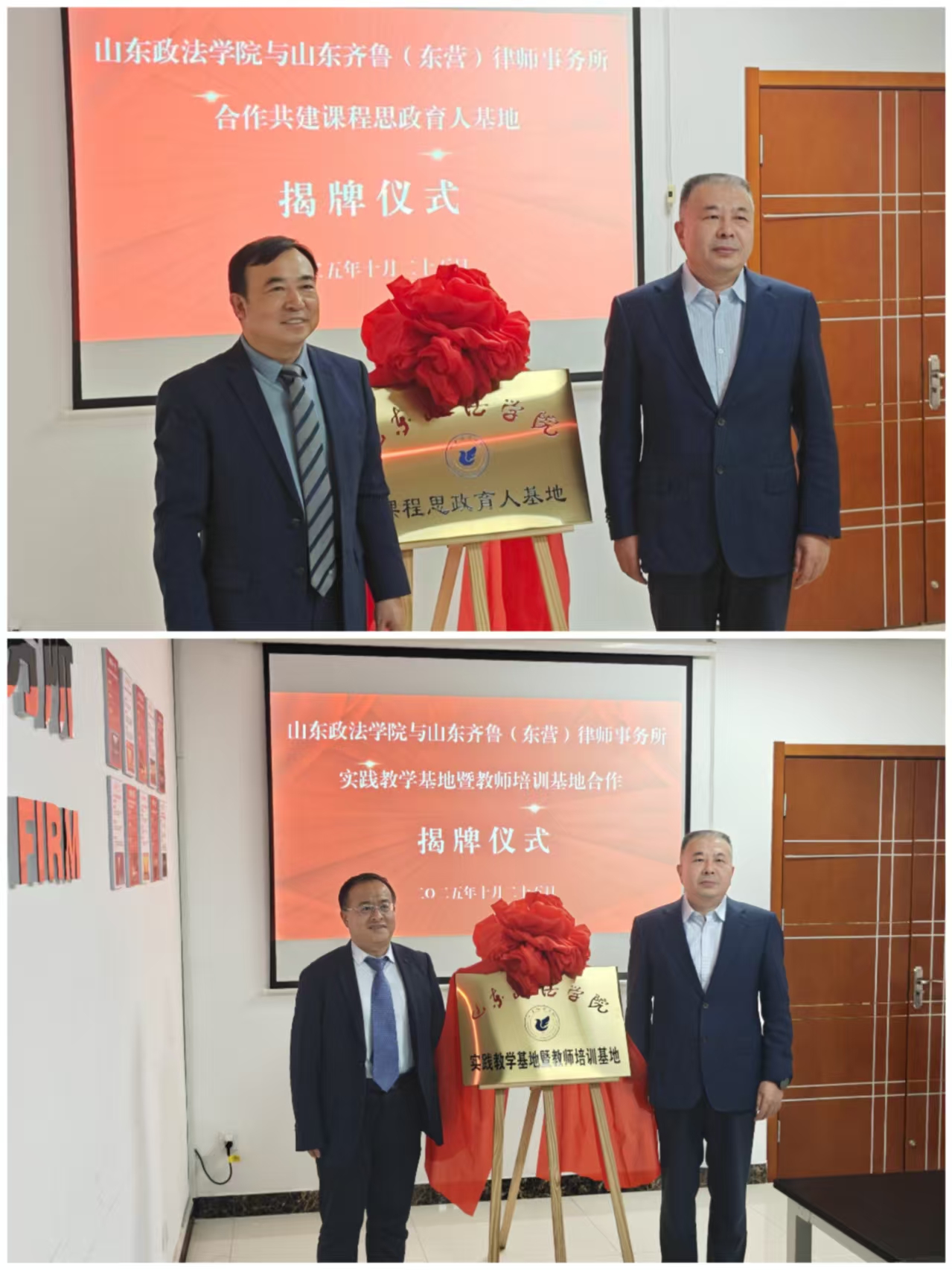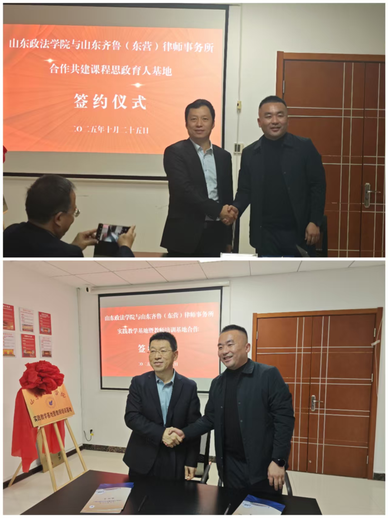 10月25日,山东政法学院党委委员、副校长窦衍瑞一行5人前往山东齐鲁(东营)律师事务所(以下简称“齐鲁东营律师所”)开展实践教学基地暨教师培训基地、课程思政育人基地揭牌签约活动。齐鲁东营律师所主任王建强、山东政法学院发展规划处处长张建波、经济贸易法学院党委书记于万涛、经济贸易法学院院长刘万啸、经济贸易法学院副院长綦书纬等参加活动。