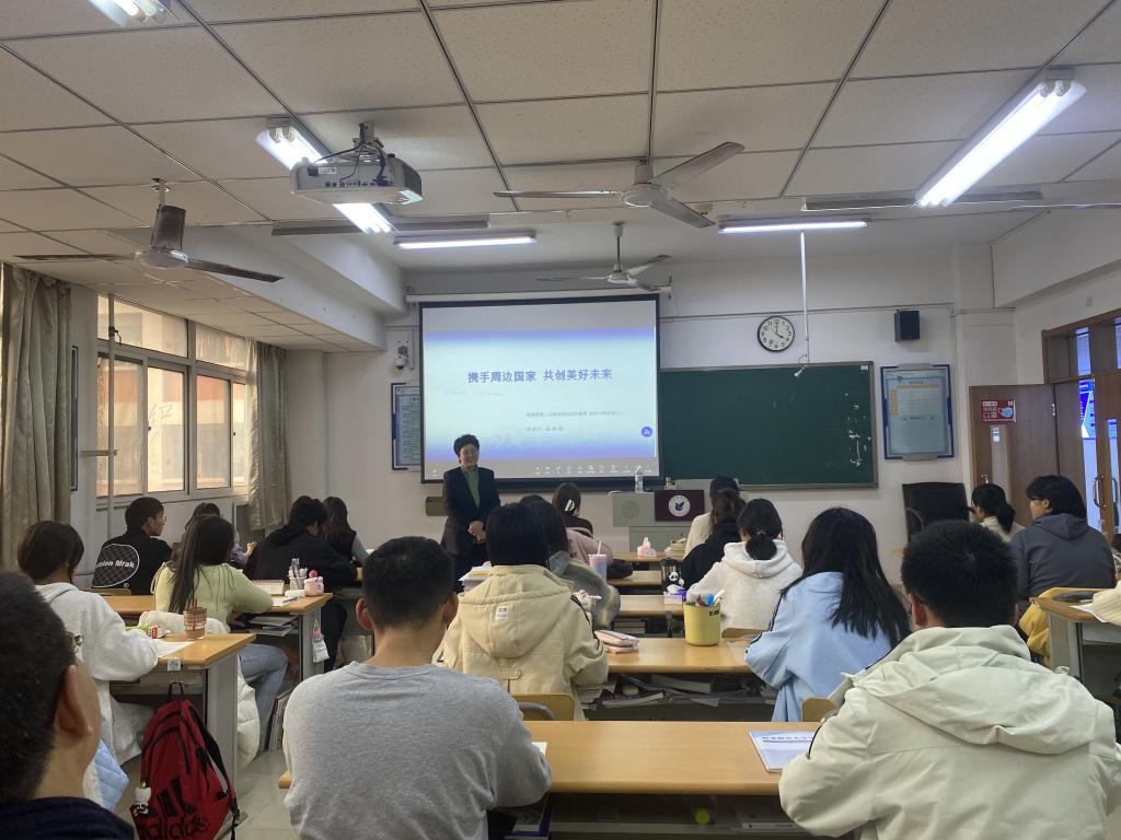 为推进领导干部联系新生班级工作制度走深走实,助力 2025 级涉外法治实验班新生筑牢家国情怀、拓展全球视野,10月 28日,学校党委委员、副院长胡晓清走进所联系的该班级,以“携手周边国家,共创美好未来”为主题,为同学们讲授了一堂兼具思想深度与专业温度的思政课并与学生座谈交流。