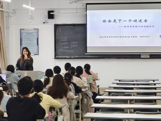 为充分发挥优秀学子的朋辈引领作用,引导新生科学规划大学生涯,近日,经济贸易法学院面向2025级法律事务专业学生举办“学长学姐进课堂”经验分享会。活动特邀2023级法学2班学生王紫凝担任主讲,围绕“你会是下一个讲述者”这一主题分享成长经验,为新生适应转变、明确方向提供指南。