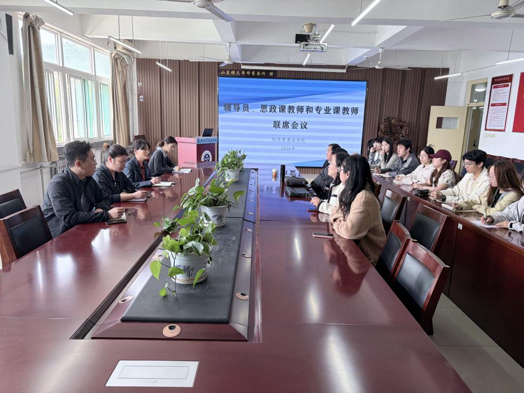 为推动思政教育、专业教育与学生管理深度融合,切实提升学院育人工作质效,4月23日,经济贸易法学院组织召开辅导员与思政课、专业课教师联席会议。学院党委副书记王晓瑜,部分思政课、专业课教师,辅导员、学生代表参加会议。